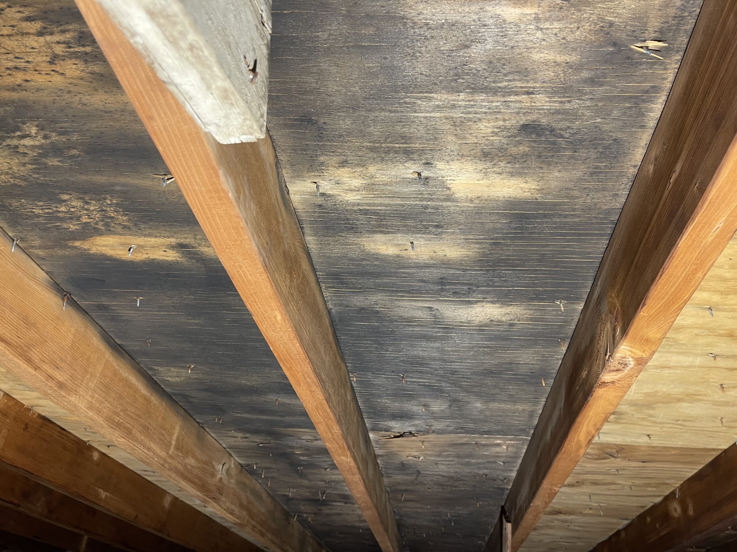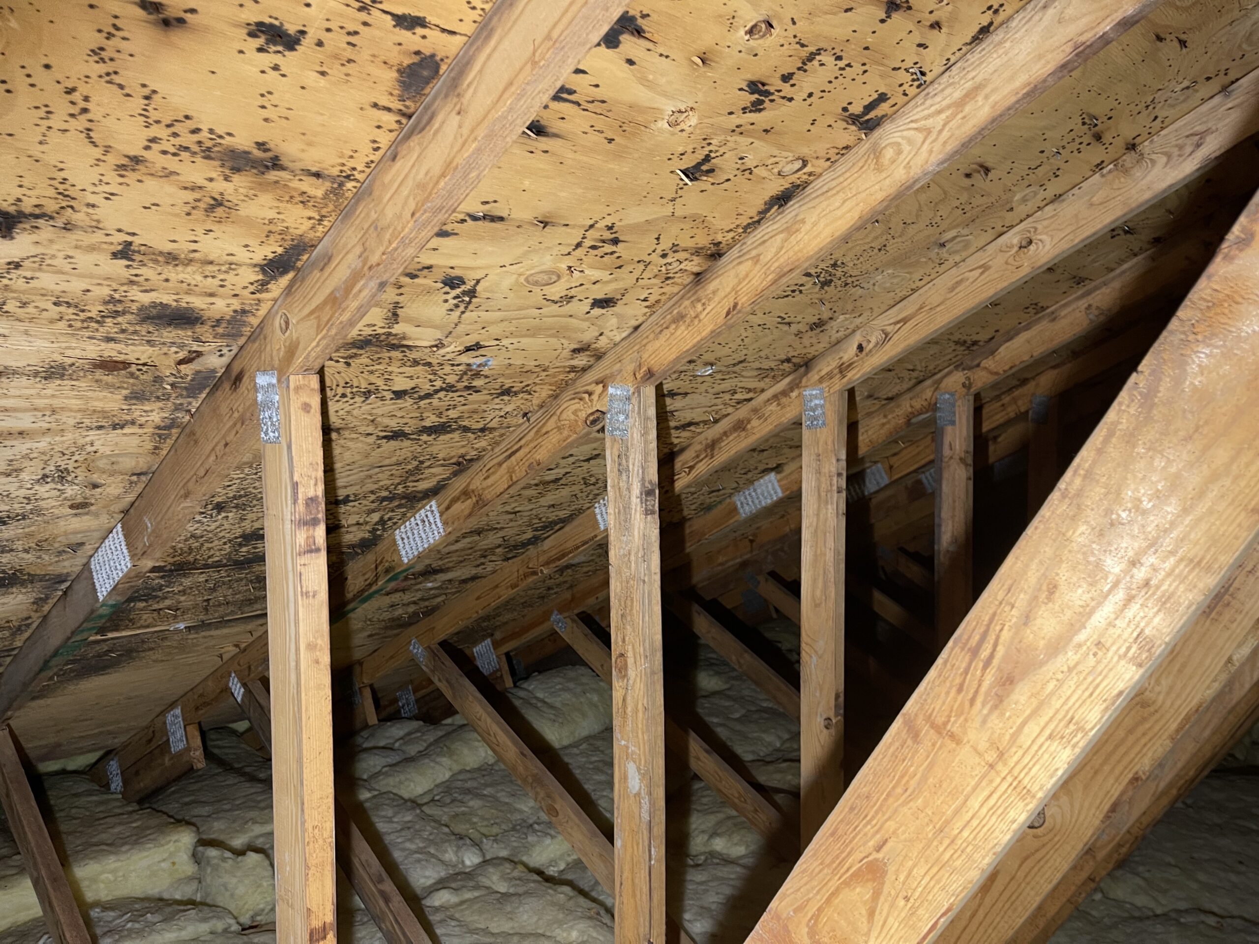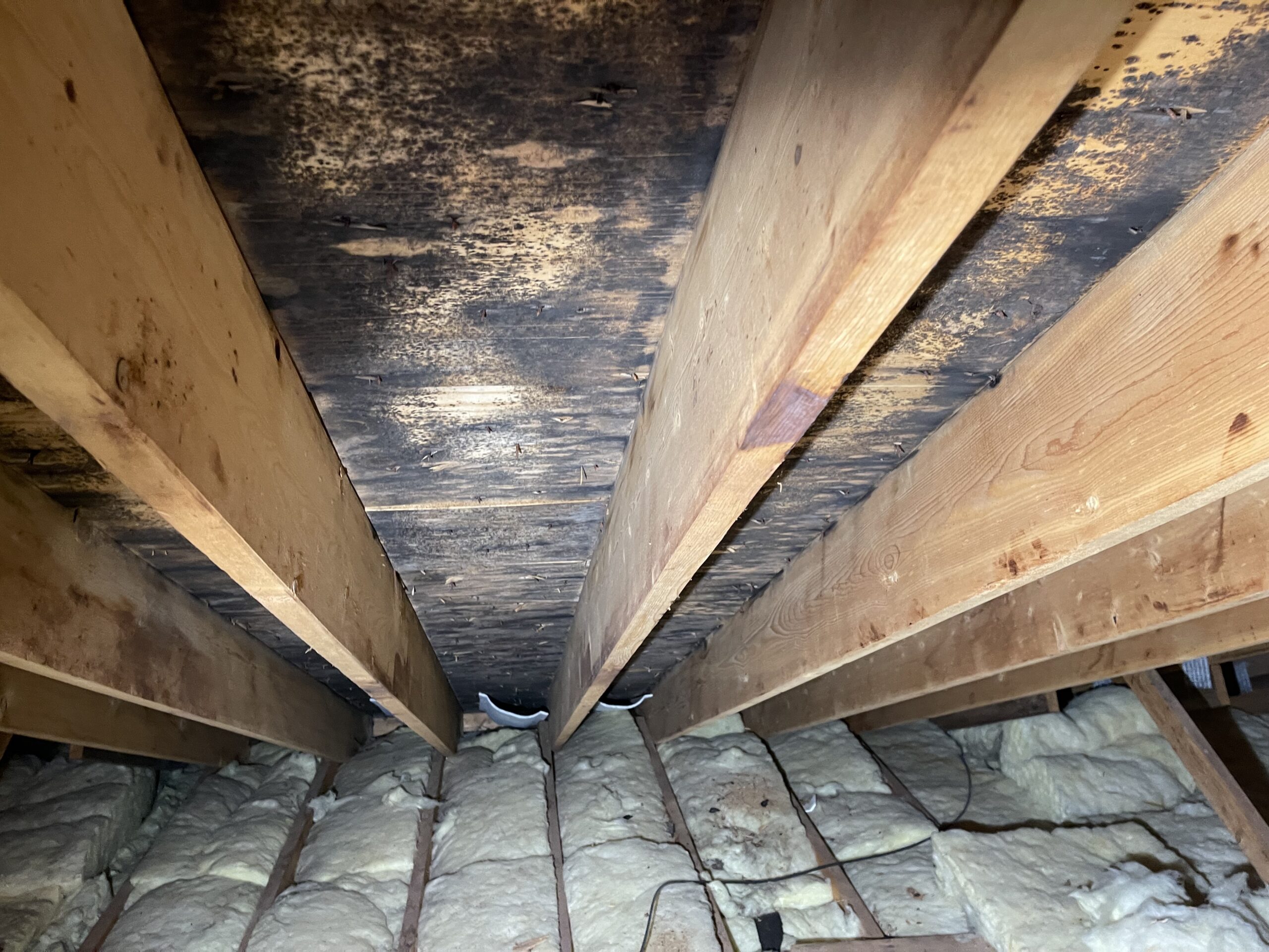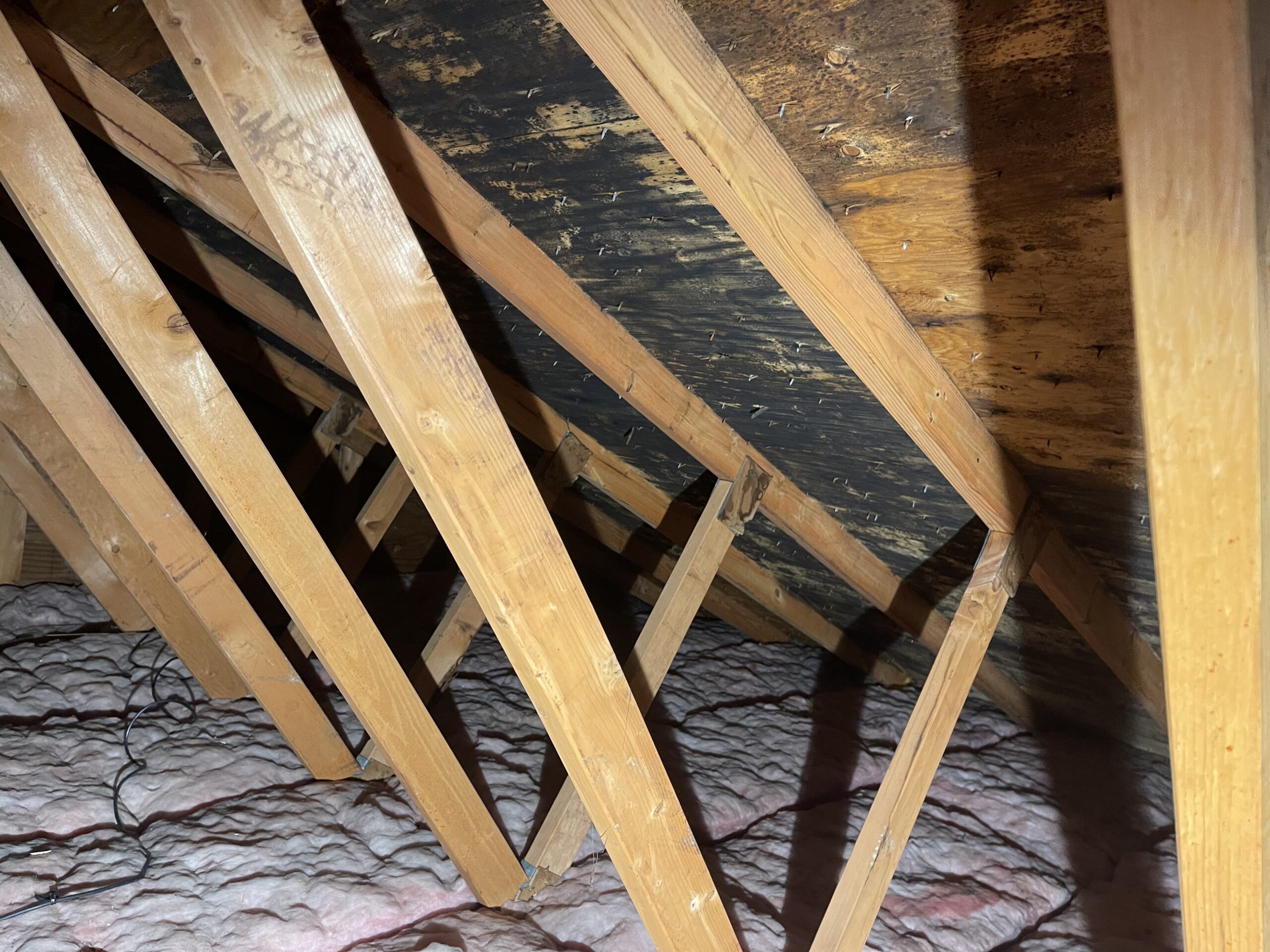 Mold growth on joists due to limited airflow Attic mold due to insulation stuffed soffits- no ventilation