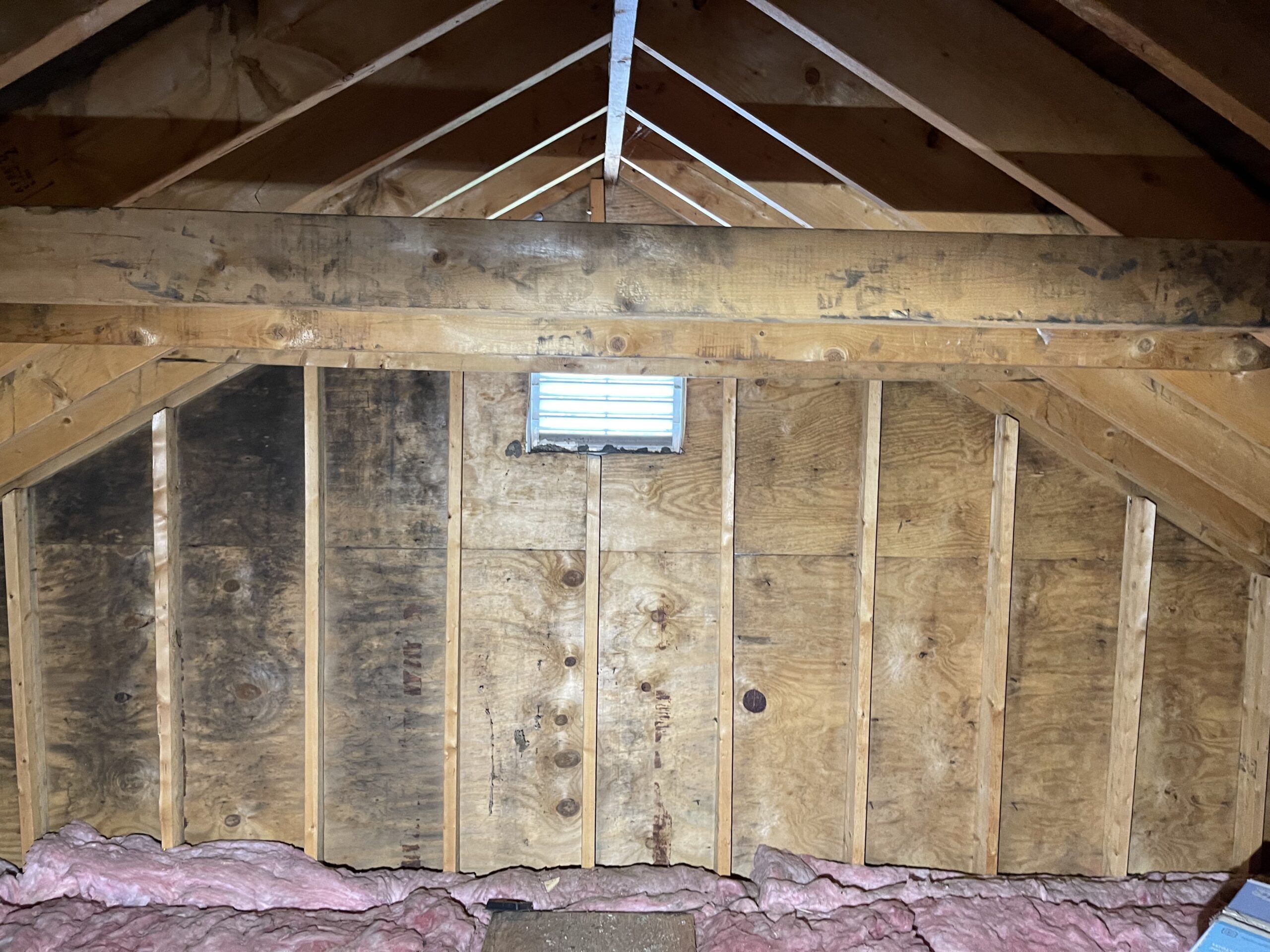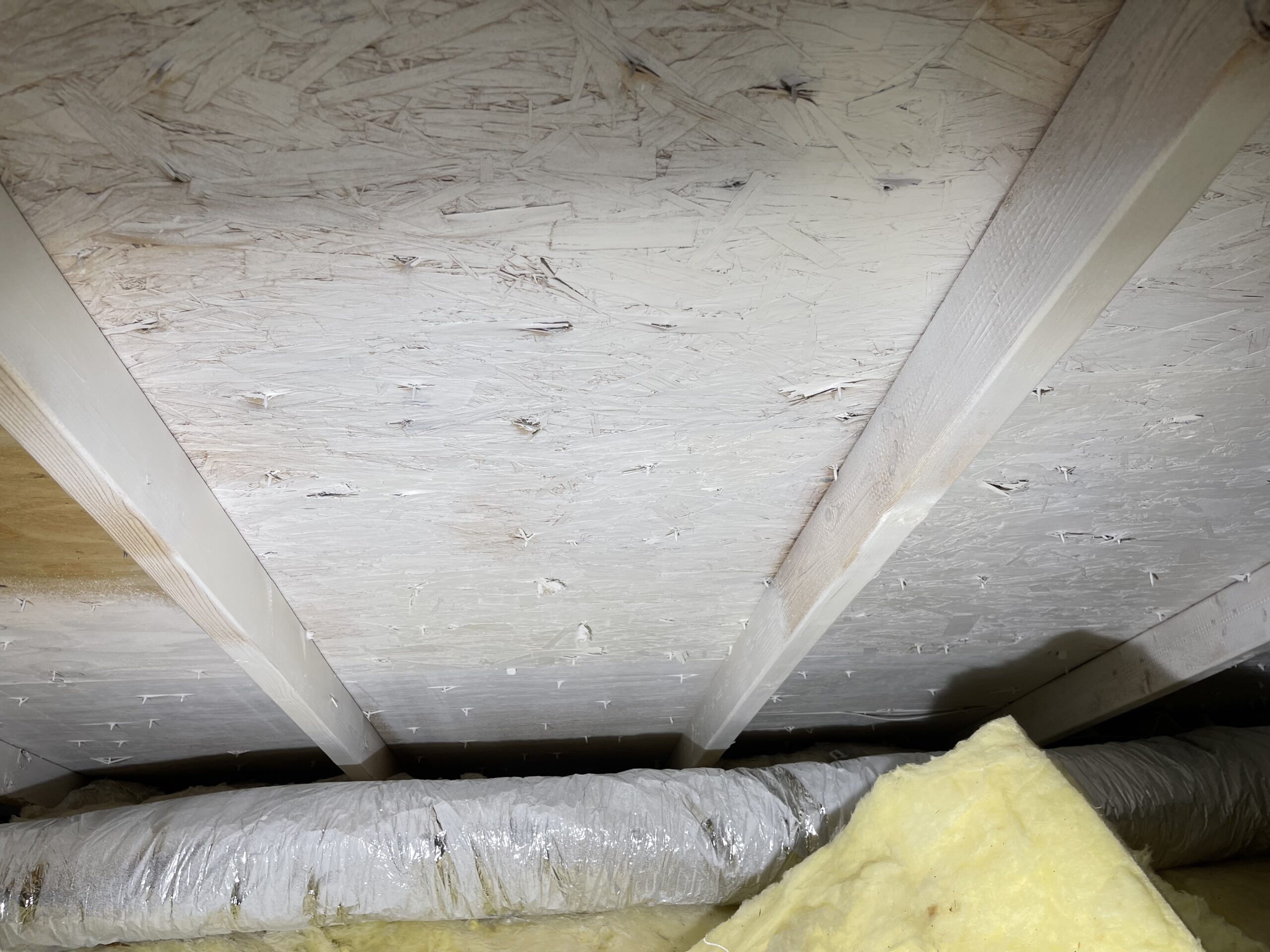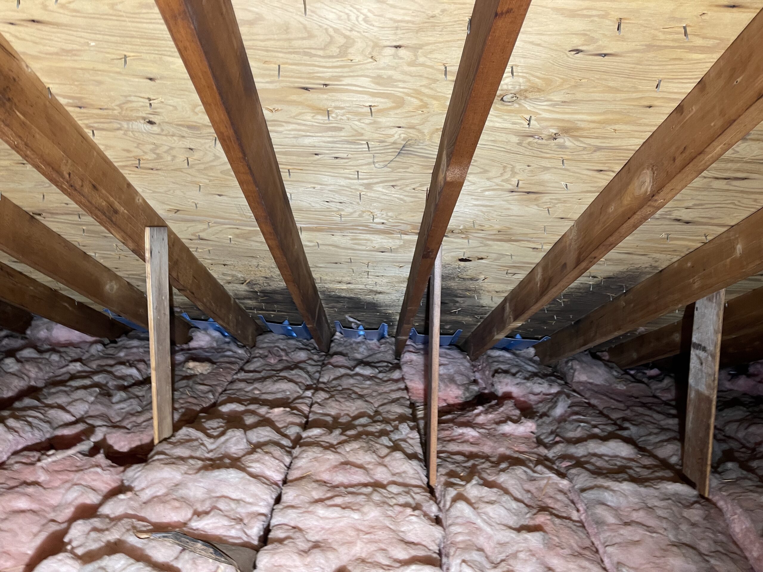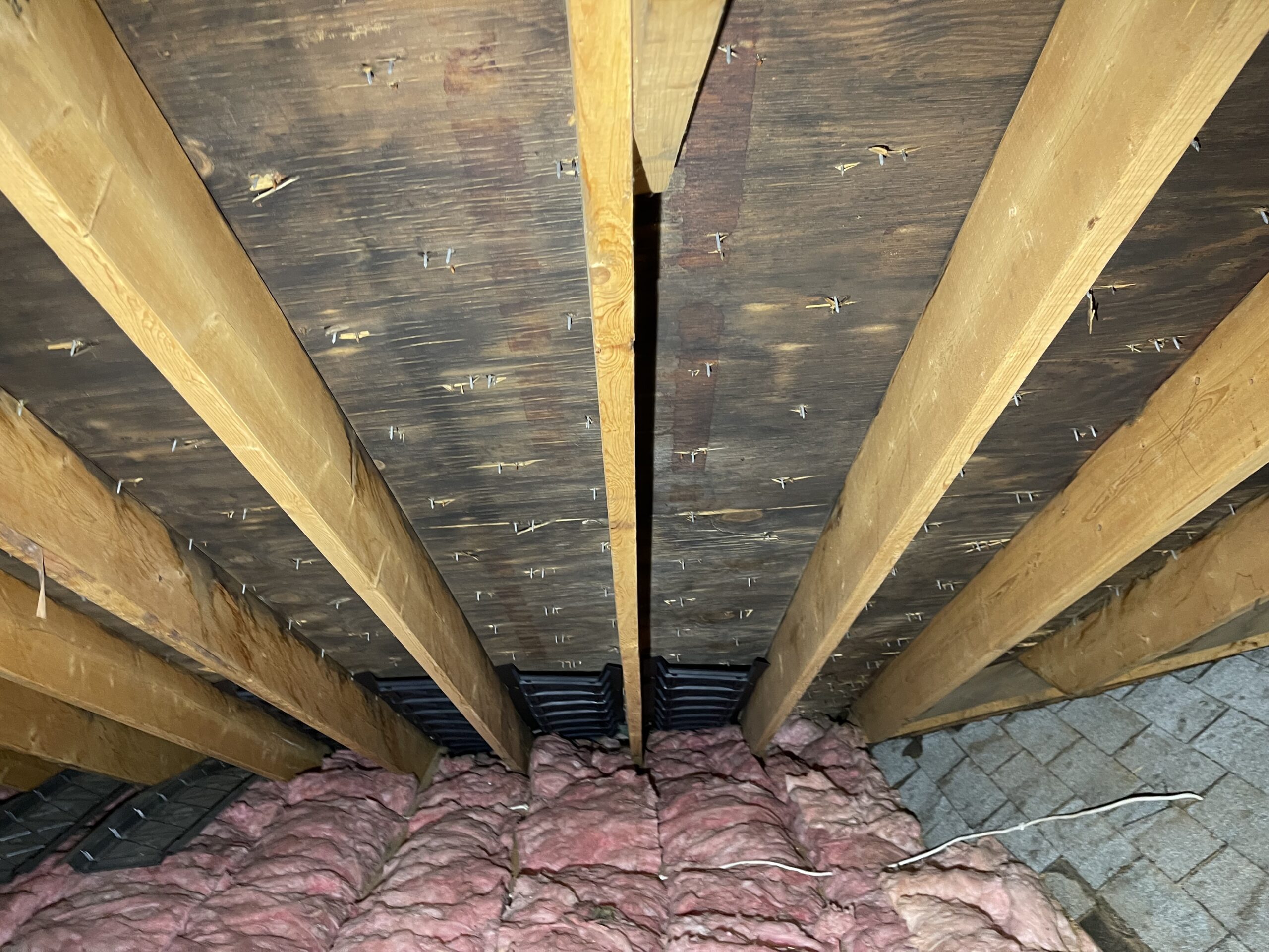 Mold growth on joists due to limited airflow Attic mold due to insulation stuffed soffits- no ventilation